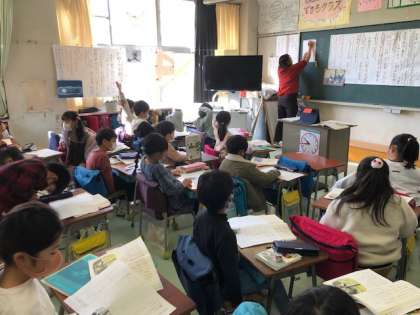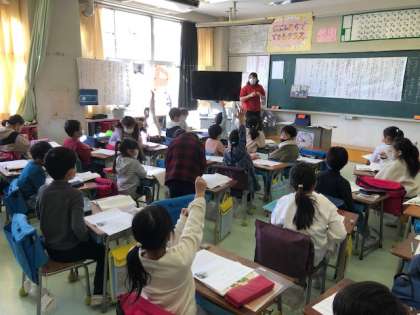 1年1組の国語「たぬきの糸車」の様子です。今日は、たぬきに気付いたおかみさんが、黙って糸車を回し続けたのはどうしてかということを考えました。読み取る活動では、役割演技を取り入れながら、子どもたちがおかみさんの気持ちをイメージしやすくなるよう工夫していました。いたずらたぬきから、かわいらしいたぬきとおかみさんの印象が変わっていく物語の楽しさを、存分に味わうことができました。