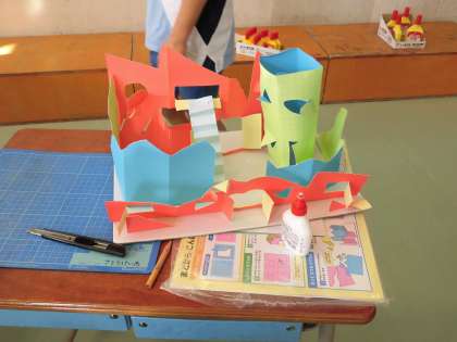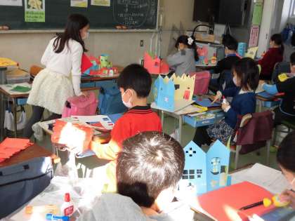 図工の授業では色とりどりの工作用紙を使って、家づくりに取り組んでいます。様々な形の窓を切り抜いたり、中の様子が見える工夫がされたりした壁を土台の紙に建ち上げる作業をしていました。室内にも階段がついていたり、動物の住人が住んでいたり細かく飾りつけをしています。窓から魚の泳ぐ姿が見える家を作っている子は「こっちが海の世界で反対側が陸の世界にしたの。」と想像力豊かな説明をしてくれました。壁どうしをくっつけるのに苦労していた子は「はじめにテープでとめておけばいいんだな。」と解決法を考えていました。完成した作品が飾られるのが楽しみです。