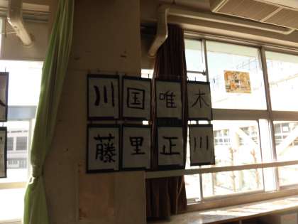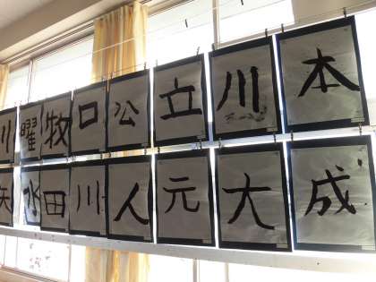 2年生の教室に筆で書いた漢字が展示してありました。教科「日本語」で筆に親しもうという授業を行った時の作品です。一人一人が好きな漢字一字を書きました。中には「昊」「唯」など小学校で習わないものや「曜」「藤」など画数の多いものもあり、作品への意気込みを感じました。硬筆と毛筆との違いを感じながらていねいに書いたことが伝わってきました。