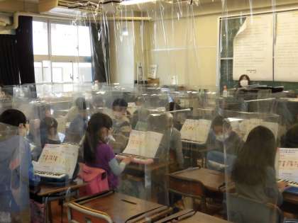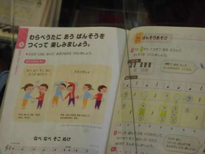 低学年音楽室から教員のピアノに合わせて「なべなべそこぬけ」を演奏する鍵盤ハーモニカの音が聞こえてきました。教科書を参考にして考えた伴奏を順番に発表していきます。使う音は3音だけですが、組み合わせの違いで何とおりも作ることができます。