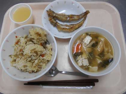 豚肉とごぼうのごはん ししゃもの天ぷら 豆腐汁 りんごゼリー 牛乳