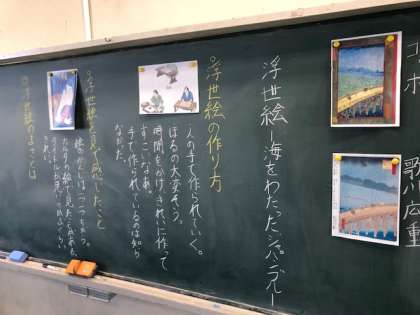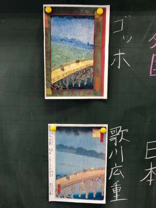 4年1組の道徳は、我が国の伝統文化を見直し、誇りに思う気持ちを育む授業を行いました。始めにゴッホと歌川広重の関係を伝えました。ゴッホが歌川広重の浮世絵に感銘を受け、歌川広重の作品を手本としていたことを知ると、子どもたちは驚いていました。浮世絵の作成過程では、彫り師、刷り師と協力して作り上げていることを知り、その緻密な作業で作品が完成していることを知りました。