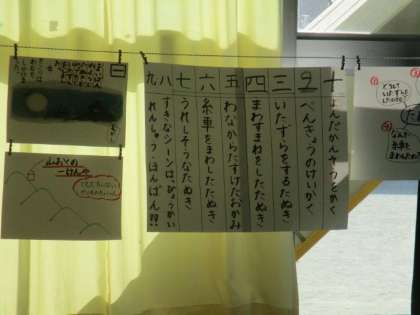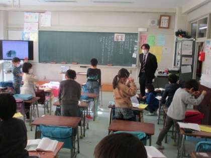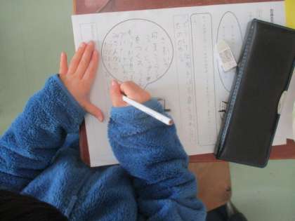 1年生では、国語「たぬきの糸車」の学習が進んでいます。冬の間、里にいたおかみさんたちが山に戻ってくると、紡いだ白い糸の束が山のように積んであります。おかみさんが土間からのぞいてみると、たぬきが糸を紡いでいますという場面です。「どうしてたぬきは、糸を紡いでいたのだろう。」について子どもたちは考えました。「毎晩、おかみさんが糸車を回す様子を見ていたから。」「たぬきもやりたかった。」「わなから助けてもらったお礼をしたかったから。」「久しぶりにおかみさんの顔を見たかったから。」「おかみさんにほめてもらいたいから。」など、いろいろな意見が出ました。私が想像できなかったような意見も出てきて感心しました。教室内に掲示されている学習の計画では、これから好きな場面を発表する会を開くようです。
