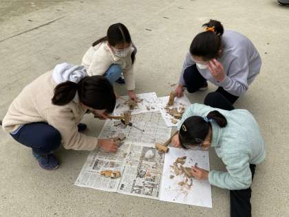 理科の地層の学習の一環で、石を砕いて化石を探しました。