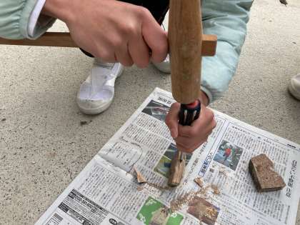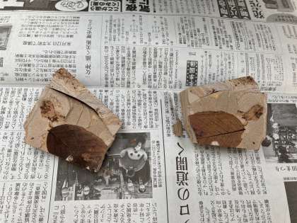 栃木県の塩原にある「自然史博物館木の葉化石園」から取り寄せた一辺8センチ程度の石を、ドライバーと木槌で割りながら、植物化石を探しました。