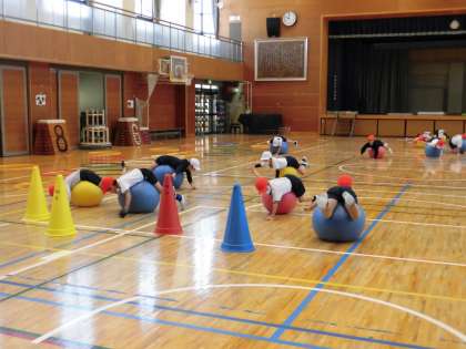 バランスボールの上に座って床から両足を離したり、足の間に挟んでジャンプしたりします。腹ばいに乗ると両足を上げ、次に片手を上げ、最後に両手上げに挑戦します。バランスを取るのが難しく、手を離したとたん前に転がってしまって「あれ〜。」と笑っている子もいました。