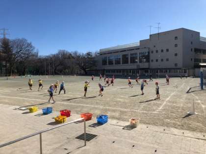2年生は体育で宝運びをしています。腰に付けたタグを相手に取られないように、宝(紅白玉)を自陣まで運び、運べた数を競い合うルールです。回を重ねるたびに、動き方に磨きがかかっています。走るスピードに緩急をつけたり、フェイントの動きを入れたりして、相手をかわす姿が見られました。直線的な動きだけでなく、踏ん張りをきかせて体を切り返し、方向転換するような動きは日常生活では磨くことができない俊敏性です。このような身のこなしを身に付けることはケガをしない安全な生活にもつながります。健やかな身体の育成のために限られた体育の時間も充実させていきたいと思います。