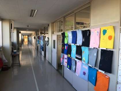 6年生の教室前の廊下に、家庭科で作製したトートバッグが飾られています。色とりどり、刺繍や飾り付けが華やかな展示となっています。この作品も小学校生活の大切な思い出になることでしょう。