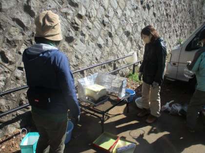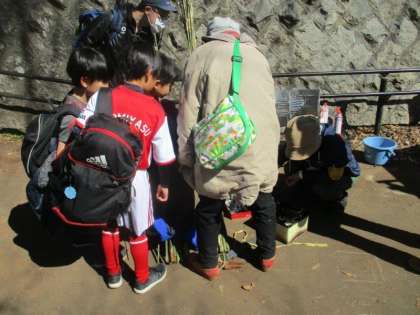 23日に成城3丁目緑地で「里山体験教室」が開かれました。コロナウイルス感染拡大防止のため、子どもたちの参加はできませんでした。「花炭づくり」や「椎茸の駒打ち」を見せていただきました。花炭は、松ぼっくりやハス等をカセットコンロで不完全燃焼させてつくるそうです。2時間程度で完成しました。