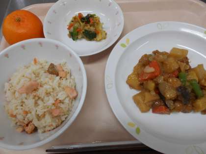 鮭ごはん 揚げ煮 白菜のおかかあえ ぽんかん 牛乳