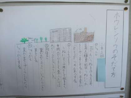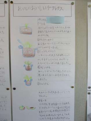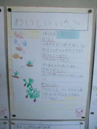 2年生が育ててきた野菜について、まとめた作品が教室の壁面に掲示されています。育て方や育ててみた感想、おいしい食べ方など、絵と文章でかかれています。毎日欠かさずに水やりをしたり、雑草を抜いたりする姿を見かけました。作品を見ると大切に育ててきたことが分かります。