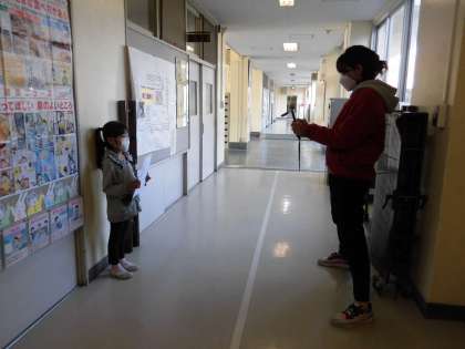 2時間目には1人1人の動画の撮影を行いました。声の大きさや間の方取り方などを教員と確認してから本番です。
