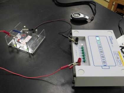 「電気と私たちの生活」という単元を学習している6年生が実験を行っていました。電熱線の上に「蜜蝋」でできたスティックを乗せ、みのむしクリップで発電器につなぎ電気を流します。スティックがどのようになるのかを観察しその変化が起こるまでにかかる時間を記録しました。スティックがどうなるかを見逃さないように、みんな真剣に観察します。蝋の溶けるにおいがして煙が立ち上ると、「あ、切れた」と声が上がりました。