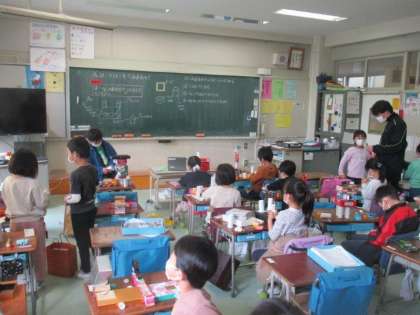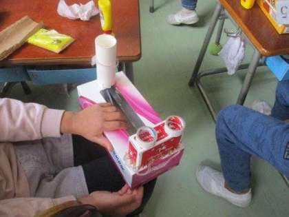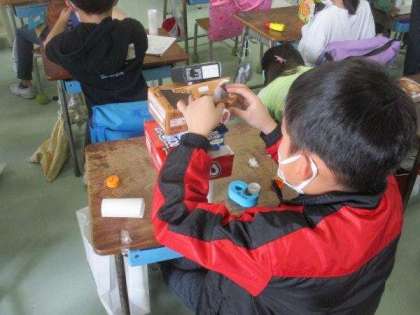 図工で、箱を組み合わせて、いろいろな形を作っています。つける形を変えたり、つける場所を変えたりしていると、いろいろな形が見えてくるようです。ボンドをしっかりつけて、外れないように気を付けていました。できあがった形は、「ネコだよ!」「宝箱だよ!」「お城だよ!」…と教えてくれました。