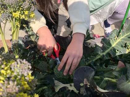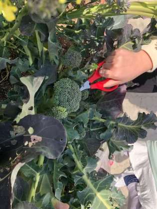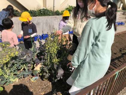 秋野菜や冬野菜などを育ててきた2年生ですが、休み時間にはまだお世話を続けている児童がいました。2年5組のブロッコリーチームです。花が咲いてしまう前に収穫をしたり、育ちすぎた枝を切ったりしてお世話をしていました。愛着をもって最後まで野菜とかかわろうとしているその姿が大変立派だと感じました。体験活動の学びの豊かさ、その価値を再認識しました。