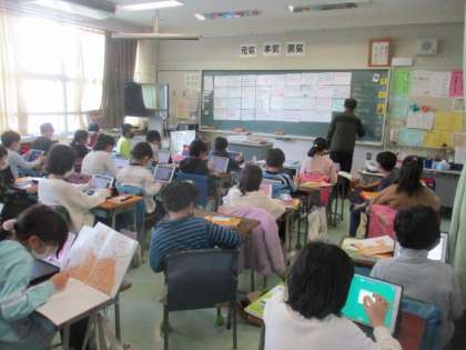 3年生が社会科で「世田谷区の様子の移り変わり」を学習しています。明治時代から現在までの交通や土地の使われ方の変化を調べます。ホワイトボードやロイロノートを使って意見を交換したり、まとめたりしていました。「いつ頃から人口が増えたのだろう。」「どうして村から区になったのだろう。」等、疑問の声が聞こえてきました。