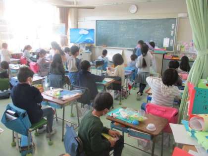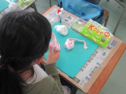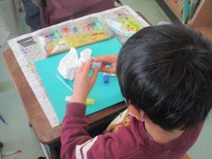 2年生が図工で「えんぴつ立て」をつくっています。紙粘土に絵の具をちょっとだけ混ぜて、家から持ってきたビンやカップ等に貼り付けていきます。絵の具を混ぜると、真っ白だった紙粘土に色が付いていきます。きれいな色に変化するので、子どもたちから、驚きやうれしそうな声が聞かれます。自分だけの「えんぴつ立て」ですね。できあがりが楽しみです。