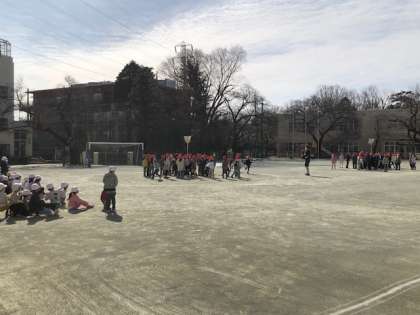 来週の14日に、6年生を送る会を行います。今年は、低学年が玉入れ、中学年が大玉送り、5年生が長縄跳びで、それぞれ6年生と対決をします。今日の1時間目は1年生が対決に向けて練習を行ないました。力を合わせて6年生に勝つぞ!と気合いを入れて取り組んでいました。