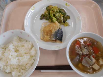 ごはん さばのおろしソース 野菜のゆかりあえ けんちん汁 牛乳