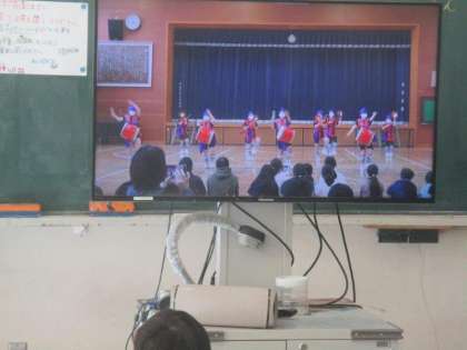 お昼の時間に、先日行われたハッピーエイサーズの「卒業演舞」の様子を全校で視聴しました。揃った「ばち」さばきや、しなやかな動きから、これまでの努力を感じました。太鼓の音は迫力があり、バックでかかっている曲が聞こえなくなるほどでした。見ている子どもたちからは、「おー!」「すごい!」「かっこいい!」といった声が上がっていました。これからもがんばってください。