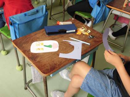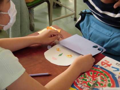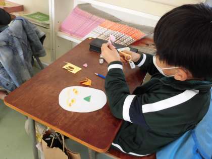2年生は図工で紙版画の版づくりに取り組みました。目、鼻、口、耳など顔のパーツを一つ一つ作り、顔の輪郭に切った土台の紙に乗せていきます。