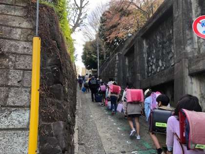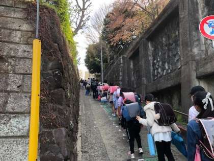 校外班によっては集団登校を実施しました。いつも混雑するお茶坂も、整然と並んで1年生を気遣いながら班をリードする班長の高学年児童の姿が立派でした。