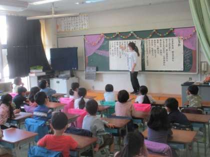1年生が校歌を練習しています。掲示された歌詞を見ながら、一生懸命に歌っていました。曲に合わせて歌詞を読むことが難しかったり、意味が難しい言葉があったりすると思います。無理をせず、ゆっくり覚えてくださいね。