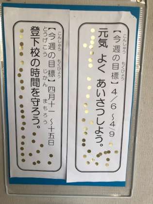 明正小では、毎週「週の生活目標」をたてて、規律やマナーを守り、みんなが安全に楽しく生活できるよう指導しています。今週は「登下校の時間を守ろう」です。朝、通学路に立っていると時間に余裕をもって登校している児童がたくさんいます。遅刻しそうな児童はほぼ見かけません。子どもたちは、生活目標を意識して過ごすことができています。保護者の皆様のご協力にも感謝いたします。6年1組では、廊下に目標を掲示して、守れた人は金シールを貼るというように工夫して取り組んでいます。みんなにとって安心、安全、楽しい学校づくりに全体で取り組んでいきます。