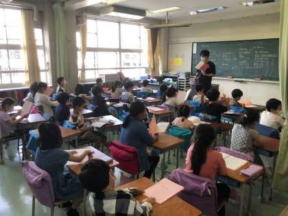 2年3組では学級会についてのオリエンテーションを行っていました。学級会ハンドブックを全員に配り、学級会の目的や進め方を説明しました。「学級のみんなで取り組みたいことや学級内での生活をより良くするために、自分たちで計画し、話し合い、決めていくんだよ」と説明があると、子どもたちの目が一気に輝きました。学級会を通して、集団の一員としてよりよい生活や人間関係を築く自主的・実践的な態度を育んでいきます。