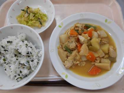 わかめごはん 春野菜のうま煮 野菜とちくわのおひたし 牛乳