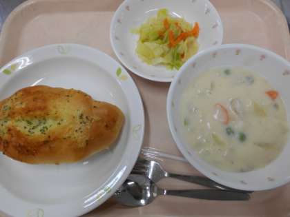 ガーリックフランス 米粉のクリームシチュー キャベツサラダ 牛乳