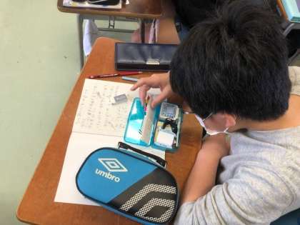 5年生は初めて学習する教科「家庭科」がスタートしました。5年1組では、裁縫用具の名前や正しい使い方を確認し、覚える学習をしていました。「チャコペンシル」「針山」「ぬい針」「ミシン針」「まち針」など、いろいろな種類の用具があるので、最初から覚えるのは大変そうでした。大切に、安全に用具を使いながら、用途に応じた使い方ができるよう指導していきます。