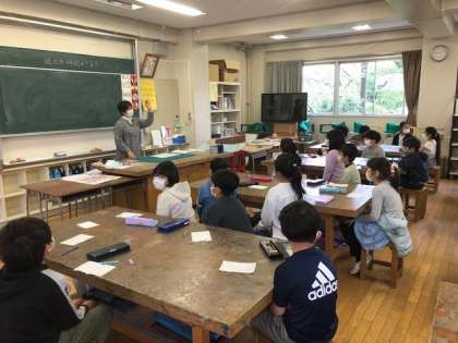 4年生になると図工専科教員による図工の授業が始まります。それに合わせ活動場所も図工室に変わります。木材や染料などの香りがうっすらとする図工室は子どもたちの創作意欲をかき立てます。今日は図工専科教員に自分のことを知らせる紹介カード作りや図工の学習のきまり、図工室のきまりなどを確認しました。