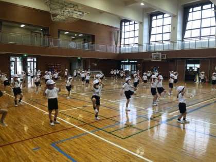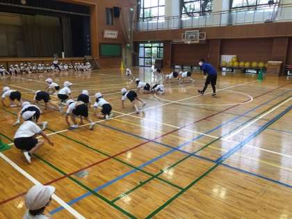 1年生のコオーディネーショントレーニング特別授業の様子です。「くの字運動」「ラディアン」などの体幹の感覚や体幹と四肢とが連動へつなげる神経を刺激する運動に取り組みました。その後は鬼遊びなどの要素を取り入れながら、最後まで楽しく運動しました。