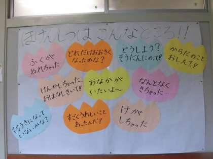 本校には養護教諭が2名いて、日々児童の様子を見守っています。保健室をより身近に感じ、在校生はもちろん、1年生や新しく転入してきた児童にも安心して学校生活を送ってほしいという願いがこめられています。