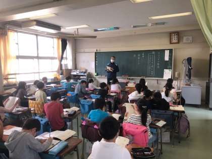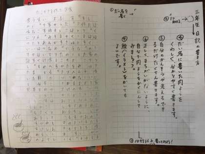 3年生は学年で統一して日記を書く宿題を行います。3年5組では日記の書き方を指導していました。1.題名に選んだ内容を詳しく、分かりやすく書くこと。2.自分の感想や考えをできるだけたくさん書くこと。3.間違いがないように見直しをして確認すること。4.絵(イラスト)を添えてもよいこと・・・この4点を抑えることとして指導していました。プリントの左側には、3年担任が書いた日記の例を示していました。「たこやき」を題材に、内容豊かに書いていました。この例を参考に、これから3年生は日記を書いていきます。31人の学級の児童とのコミュニケーションツールの一つとして、担任も大切にして取り組んでいきます。