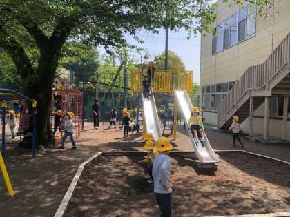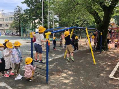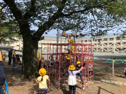 1年生は固定施設を使って楽しく遊んでいました。固定施設はルールを守って正しく使わなければ大きなけがにつながります。事前に担任から固定施設を使ううえでの約束事を指導しました。どの子もその約束を守って楽しく遊ぶことができていました。固定施設で遊ぶことはとても大切な運動につながります。物を握る力、自分の体を支える力、バランス感覚など、この先の運動を支える重要な経験です。活用する時間を確保しながら、健やかな身体づくりに努めていきます。
