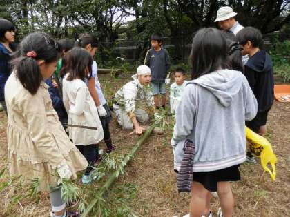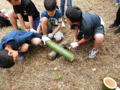 4年生の里山体験学習です。この日は、里山にある竹を利用しての体験活動です。