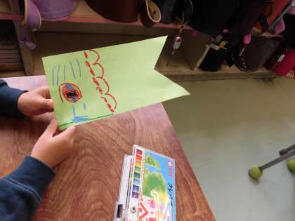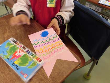 好きな色のこいのぼりを選んだあと、クレヨンで模様をかきます。たくさんの色を使ってうろこをかいたり、長いまつげのついたぱっちりした目をかいたり、夢中で作品を仕上げていきました。涙を流したような目をかいている子供に「泣いているの?」と聞くと「違うよ。こいのぼりは外にあるから、雨でぬれちゃうんだよ。」と答えてくれました。一人一人に話を聞いたら、さらに楽しい説明を聞かせてもらえそうです。5月5日には、みんなの力作がおうちにかざられることでしょう。