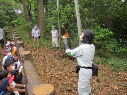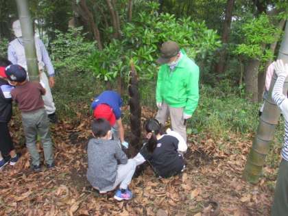3年生が里山のタケノコ掘りの様子を見せてもらいました。里山コア会議やトラストの方々が、里山の竹林を整備するためにタケノコを掘っています。子どもたちは、タケノコになる前の根を見たり、タケノコの皮に生えている毛を触ったり、持ってタケノコの重さを感じたりすることができました。タケノコは2ヶ月程度で高さ16m位の竹に育つそうです。子どもたちからも驚きの声が上がりました。