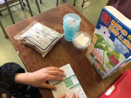 5年生の理科では種子のはたらきと発芽の条件について、実験キットを使用して学習を進めていきます。「イネ」「インゲン」「とうもろこし」の3種類の種子を使って実験を進めていきます。「なぜ春になると植物は芽を出すのだろう」という学習問題に対し、予想をたて、予想を確かめるために実験していくという動機付けをしました。予想や発芽に必要な条件について、これまでの経験から考え、活発に意見を出し合っていました。