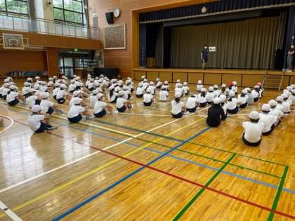 本校の4年生は運動会では「エイサー」をやります。今日は運動会に向けての気持ちを高めました。4年生が掲げた目標は「楽しむ」です。一生懸命「楽しむ」、周りと気持ちを共有して「楽しむ」、時にはうまくいかないこともあるけどそれも共有して「楽しむ」、こんな姿を期待しています。