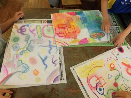 描画材のパステルを使い、描いたり、消したり、色を混ぜたり、ぼかしたりして、自分に合う色と形を見つけて抽象画に挑戦しています。