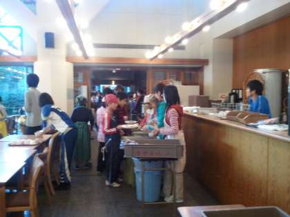 今朝から食事係の本格的活動です。朝会後、全員の食事を配膳します。しっかり食べて今日の登山に備えます。