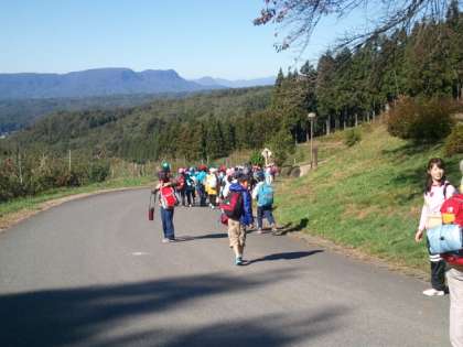 9:45 雨ごい山に向けて出発しました。校長 寺村