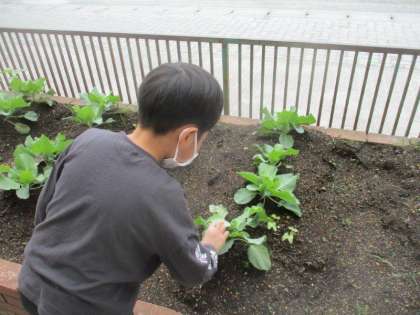 校庭の花壇のキャベツの葉に、アオムシがいました。まだまだ小さいアオムシです。昨年度も理科で観察をして、サナギからチョウに成長しました。これからどのようにチョウに成長していくのでしょう。楽しみです。
