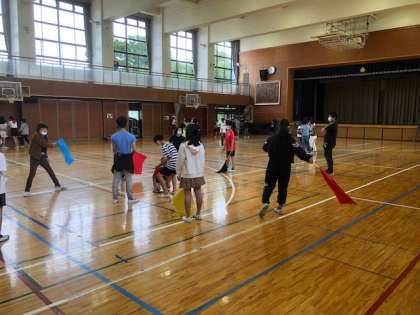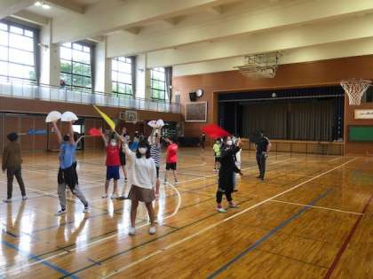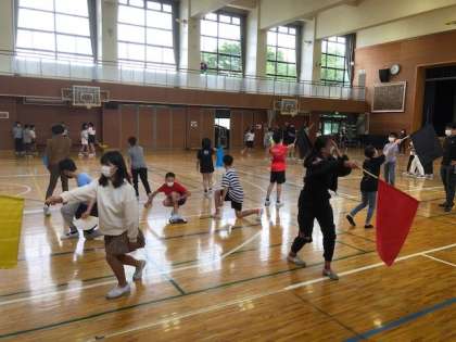 中休みの体育館では、応援団が練習を頑張っていました。声を張り上げることができない状況ですが、フラッグ等の道具を使い、息を合わせ、大きく動くことでそれぞれの組を応援する工夫をしています。これから本番まで練習を重ね、仲間を勇気づける応援になるようがんばっていきます。
