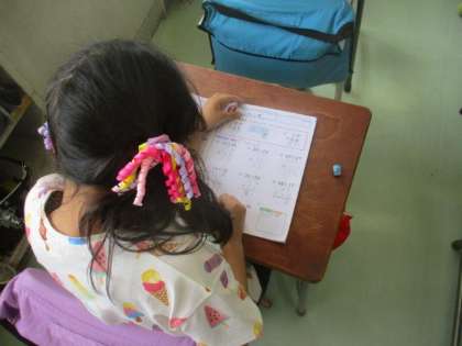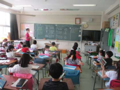 2年生が、2桁+2桁の計算をしていました。繰り上がりがあっても、位をきちんと合わせて、筆算で計算しています。位をきちんと合わせることは、これから学習するかけ算やわり算でも大切なことです(筆算を斜めに書いてしまうと、1の位なのか、10の位なのか分からず、正しい答えが出せなくなってしまいます)。面倒だなぁと思っても、きちんと合わせて書く大切さを理解してほしいと思います。