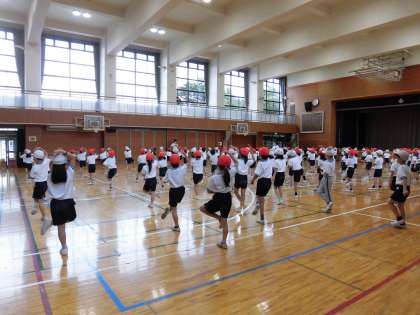 1時間目は2年生の表現の練習でした。曲をかけて最初から最後まで通しました。アップテンポで振付の種類も多いダンスを一生懸命に踊ります。人数の多い学年なので、まだ動きをそろえることが難しそうでした。引き続き2時間目には体育館に移動して細かい身ぶり手ぶりの確認や自分の前後左右の人を覚えてまっすぐ並ぶなど、より学年全体がまとまるために練習をくり返しました。