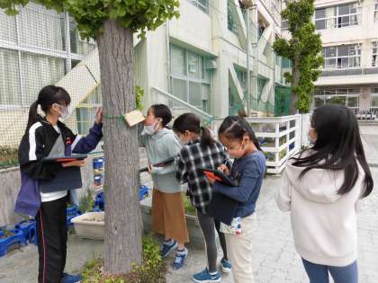 校庭でタブレットを手にした4年生が木のまわりに集まっていました。理科の学習で「自分の木」を決め、記録をつけるそうです。
